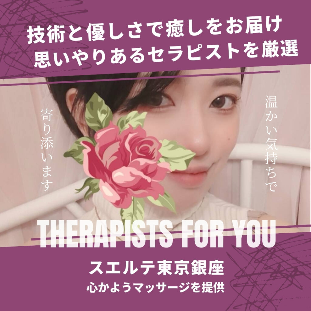 スエルテ東京では、フレッシュな魅力あふれる新人セラピストが続々とデビュー中です。初々しさの中にも丁寧な施術と心のこもったおもてなしを大切に、お客様に安心と癒しの時間をご提供いたします。ぜひ、これからの成長にご期待ください。